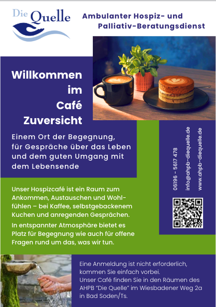 Unser erstes Hospizcafé findet am 08.03.2026 von 15 – 17 Uhr in unseren Räumen im Wiesbadener Weg 2a in Bad Soden am Taunus statt.